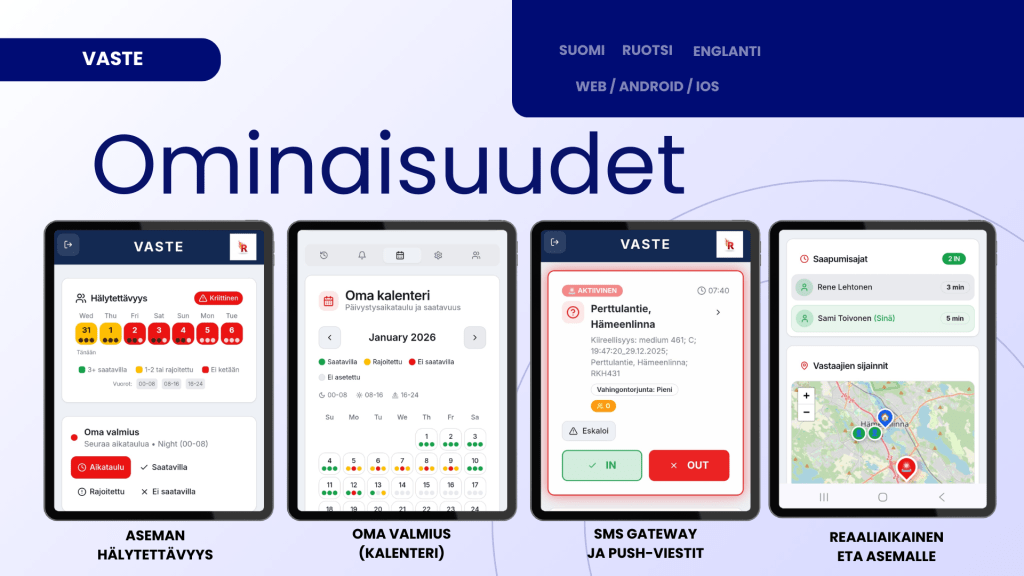 Suomessa on 15.000 sopimuspalokuntalaista eikä kukaan tiedä ovatko he hälyytettävissä juuri nyt. Hälytyssovellus VASTE on ratkaisu sopimuspalokunnan hälytettävyyden ja reaaliaikaisen vasteen hallintaan.